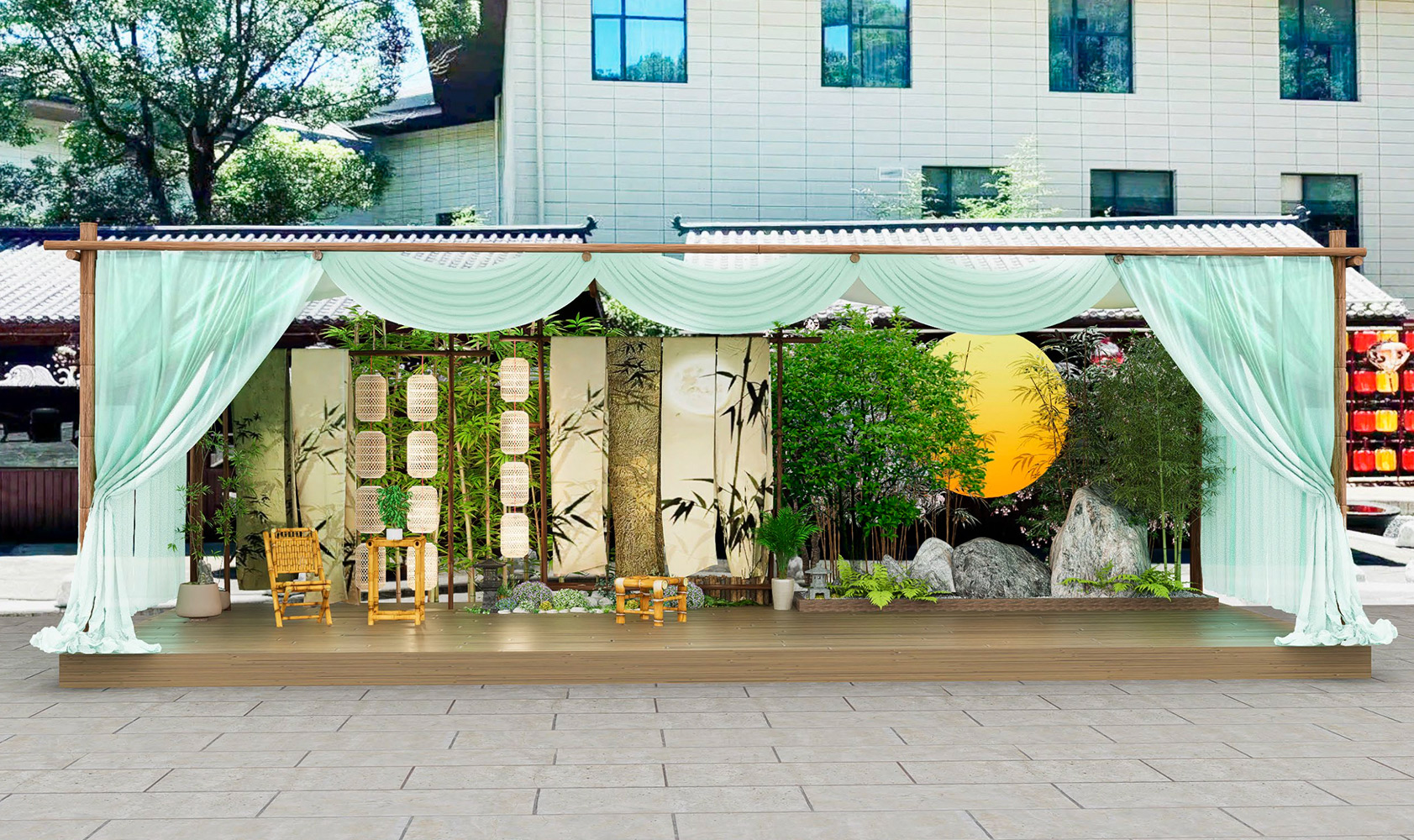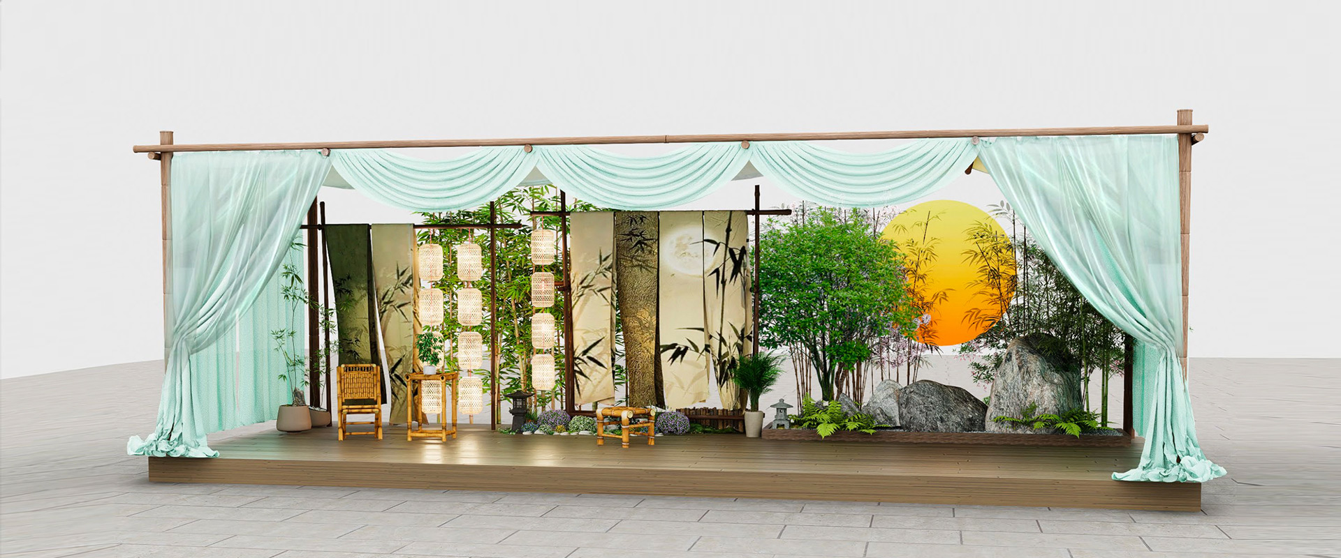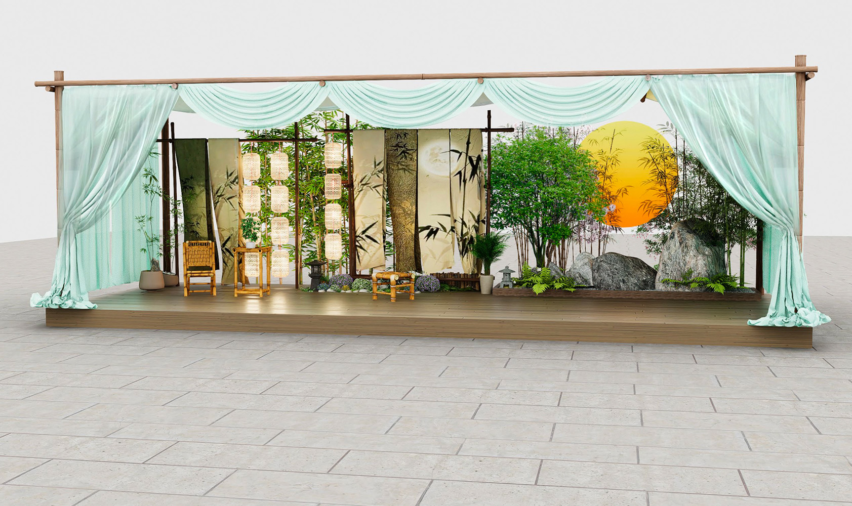 设计灵感来源于传统的东方园林元素,结合竹子、石景和灯笼等元素,打造了一个自然、宁静且富有文化底蕴的空间。这个美陈装置使顾客在享受温泉的同时,也能体验到东方古典的独特韵味。